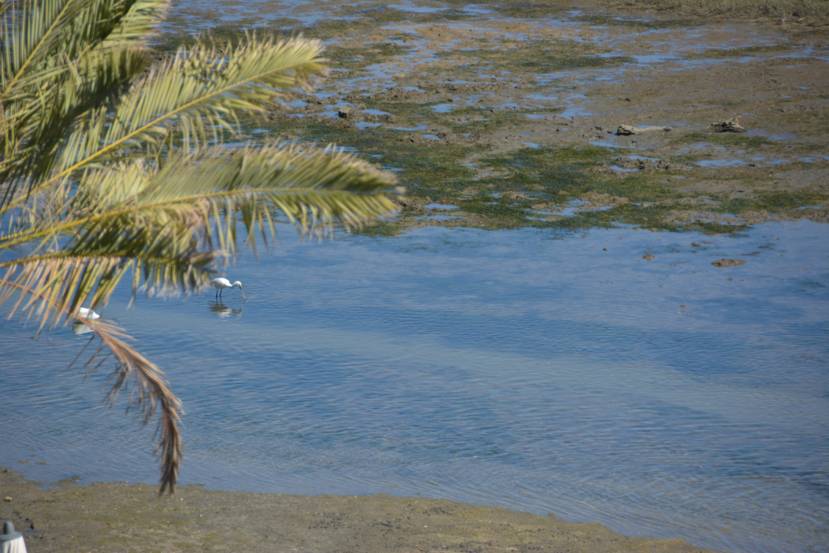 Den Nachmittag verbrachten wir dann wieder ausruhend auf dieser formidablen Terrasse – unten im ablaufenden Wasser stand dann ein Löffler mit einem Reiher und waren auf der Jagd- wozu sollte ich dann an den vollen Strand gehen wollen?