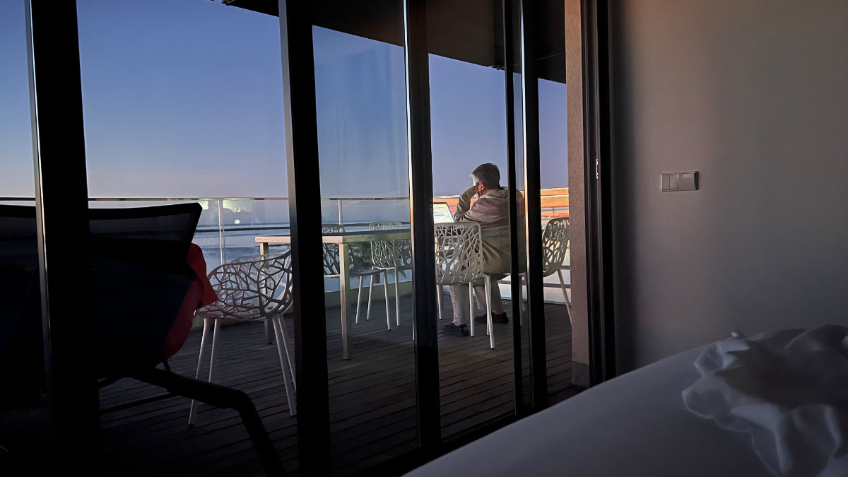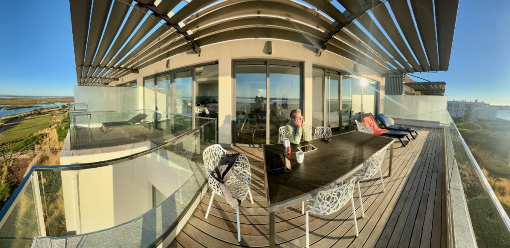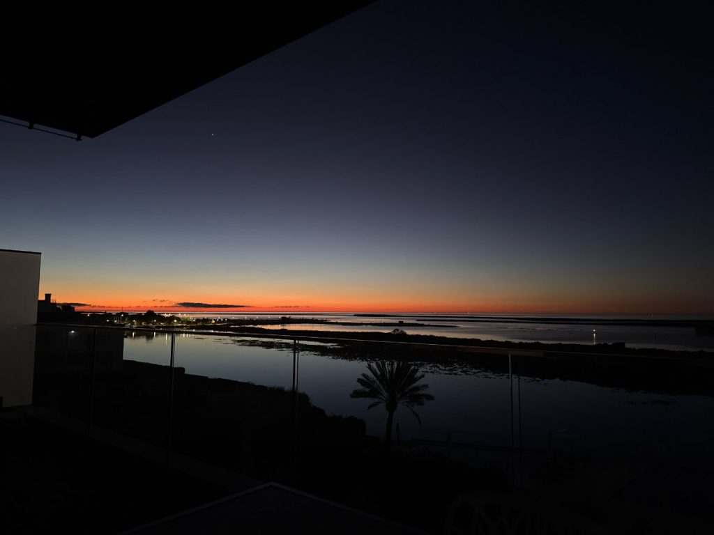 Und hier in Portugal sitze ich dann da, beobachte, wie die Dunkelheit langsam verschwindet, wie sich die Farben am Horizont und der Umgebung verändern, wie dann die Sonne aufgeht (die von unserer Terrasse supergut zu sehen ist) – schlürfe dabei meinen Morgenkaffee und bin rundherum zufrieden.